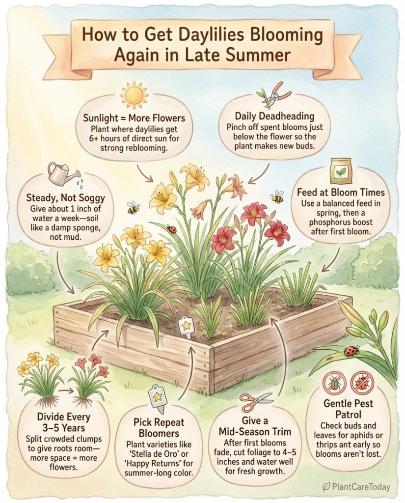 Inconsistent watering is the top reason daylilies skip their second bloom cycle. Aim for about 1 inch of water weekly.